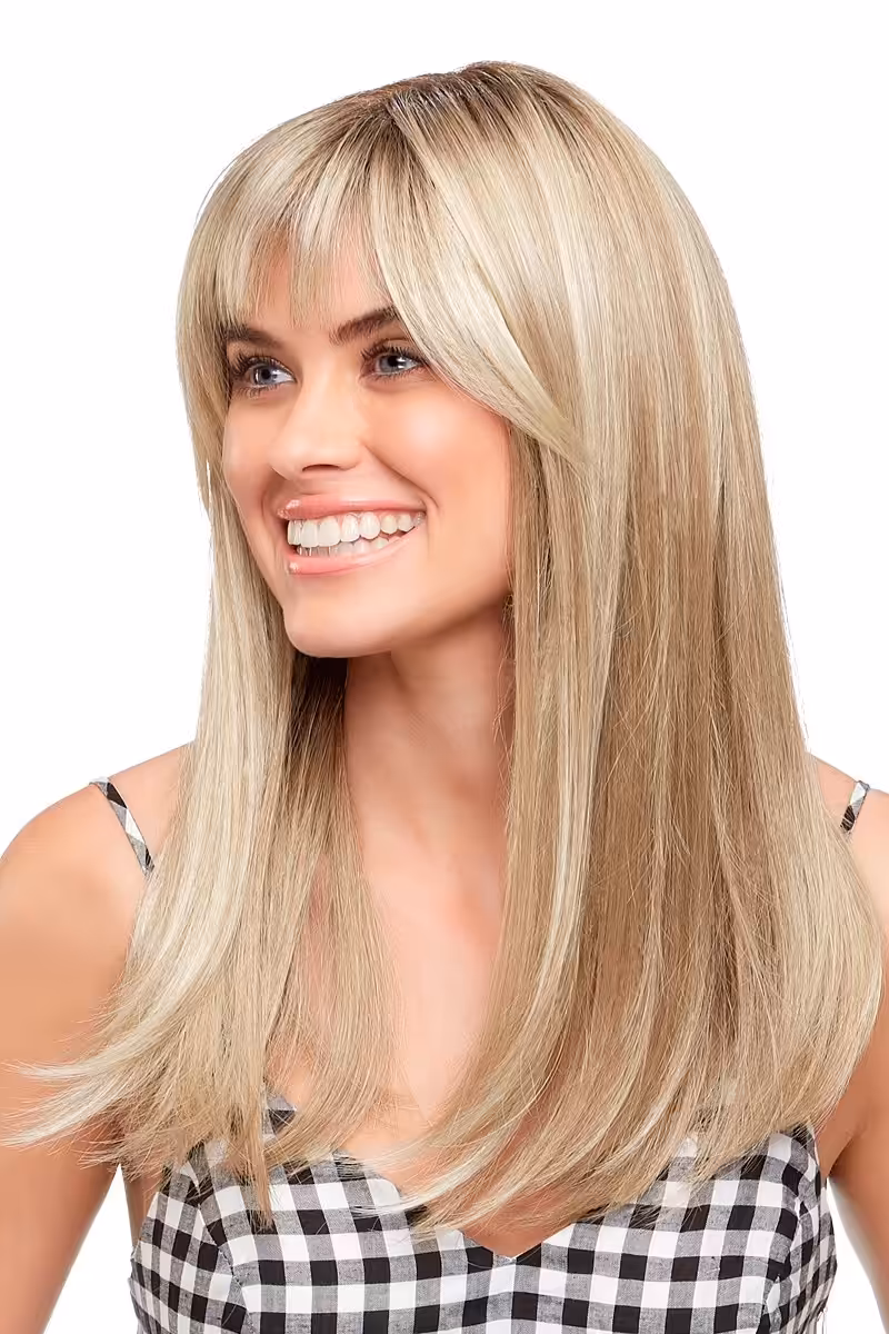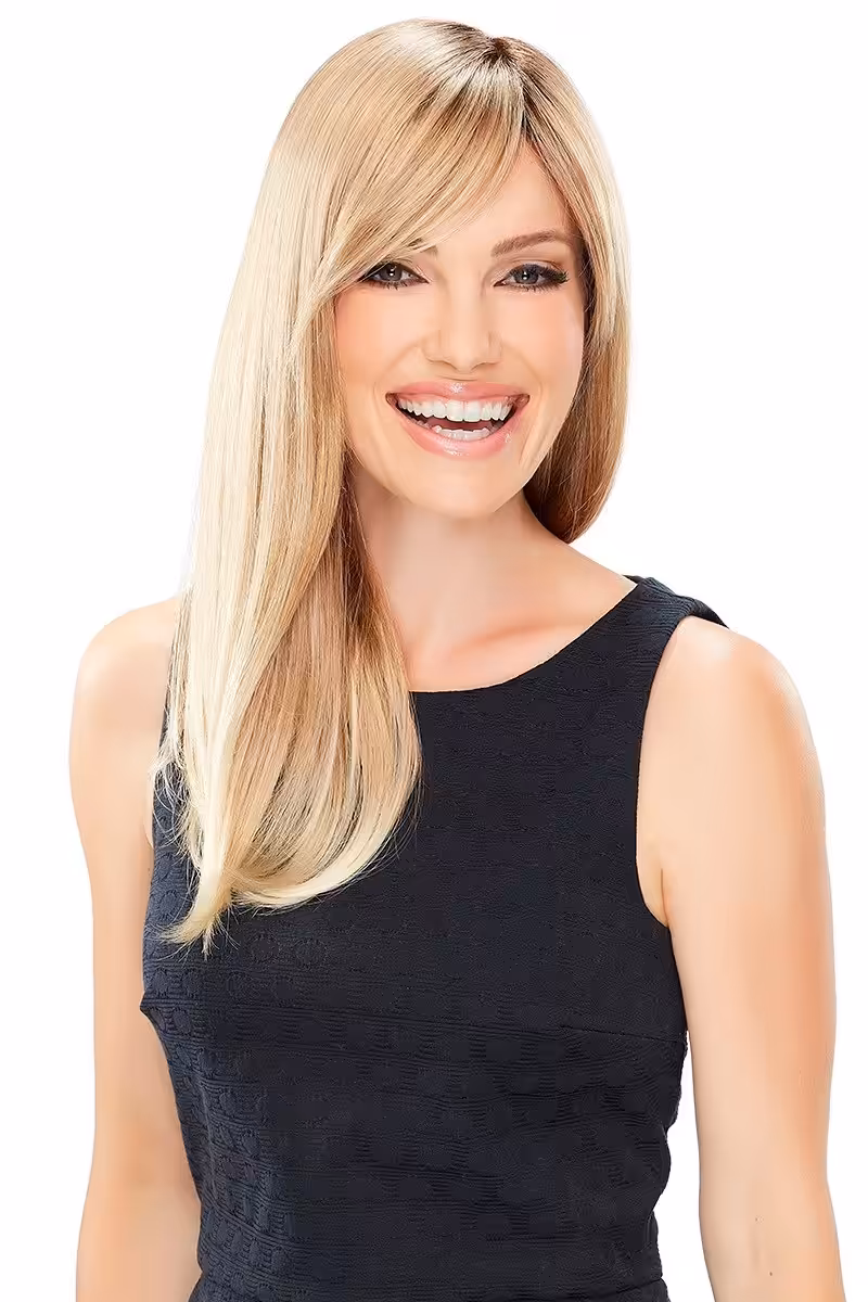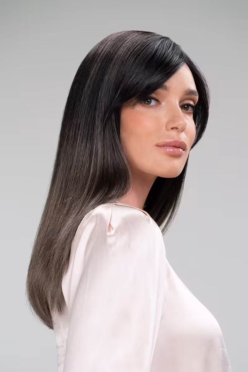 Elegant sideswept bangs and cascading long layers exude chic allure. The hand tied mono top allows for versatile styling in any direction — let your imagination reign!