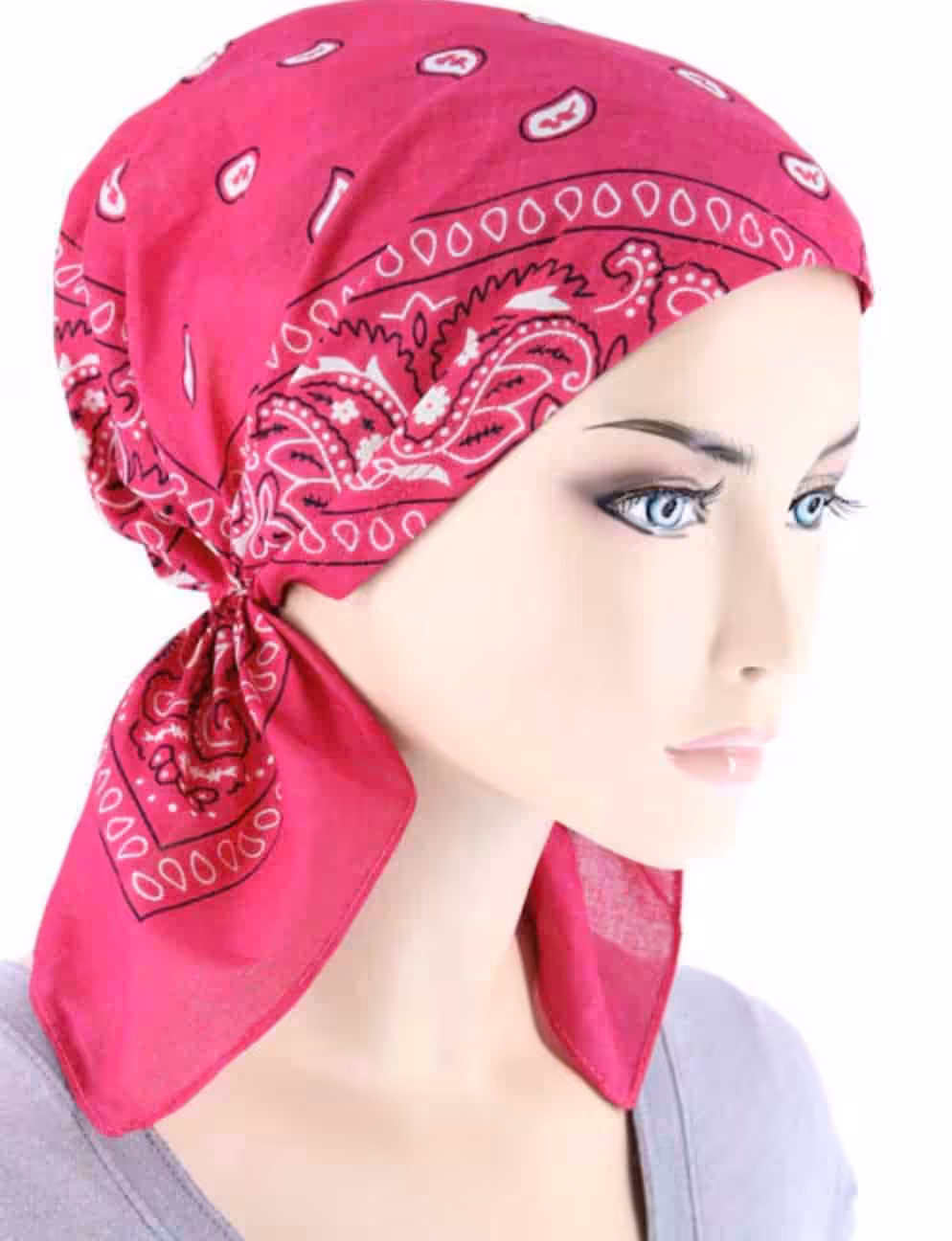 Why fuss with a square bandana when you can look stylish with no extra effort? Our pre tied 100% Cotton Bandana Scarves are ready to wear, just slip it on and off you go! Get the look fuss free with effortless beauty! Part of our Chemo Essentials™ line, which offers no frills, simple every day headcovers.