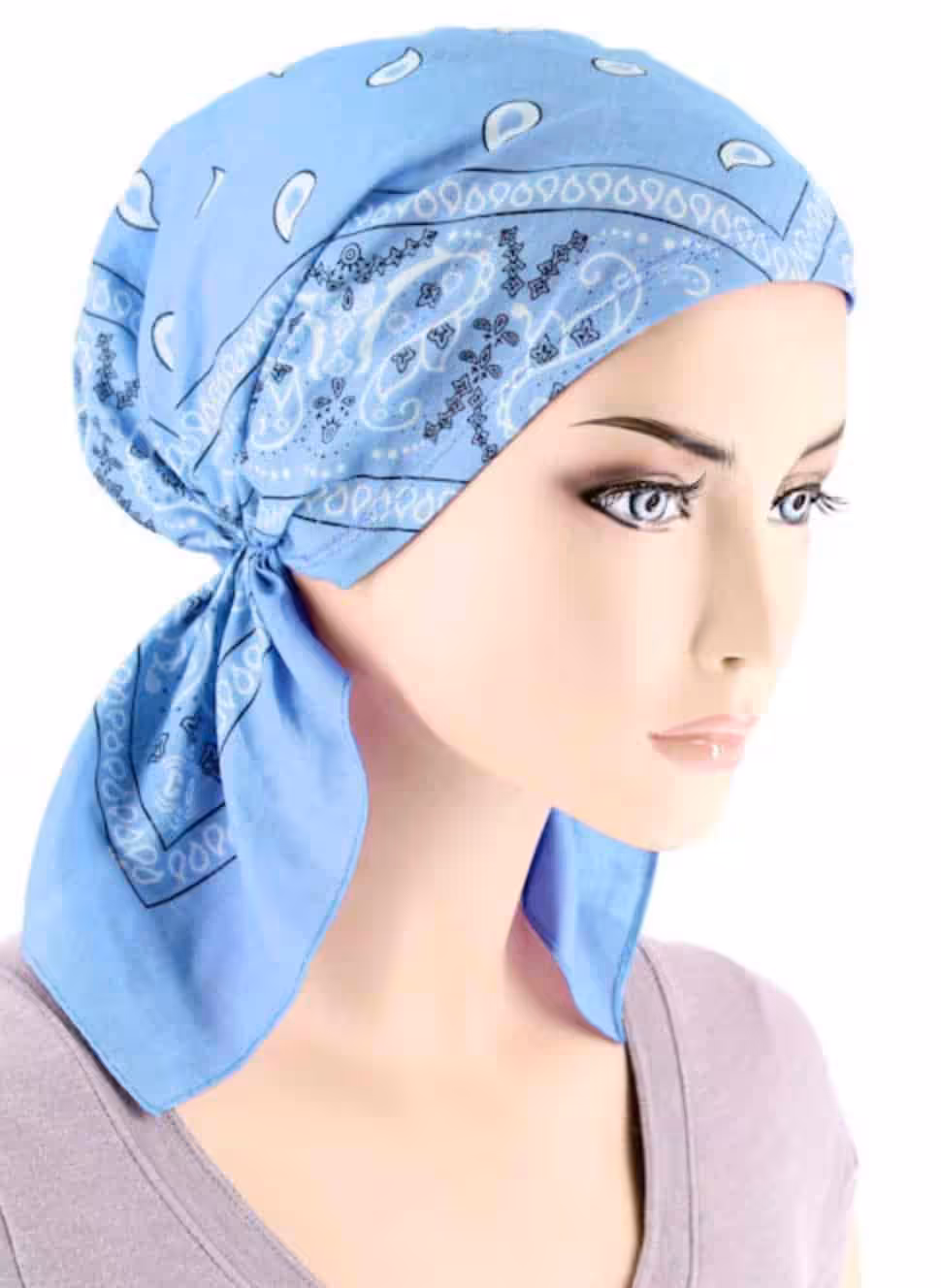 Why fuss with a square bandana when you can look stylish with no extra effort? Our pre tied 100% Cotton Bandana Scarves are ready to wear, just slip it on and off you go! Get the look fuss free with effortless beauty! Part of our Chemo Essentials™ line, which offers no frills, simple every day headcovers.