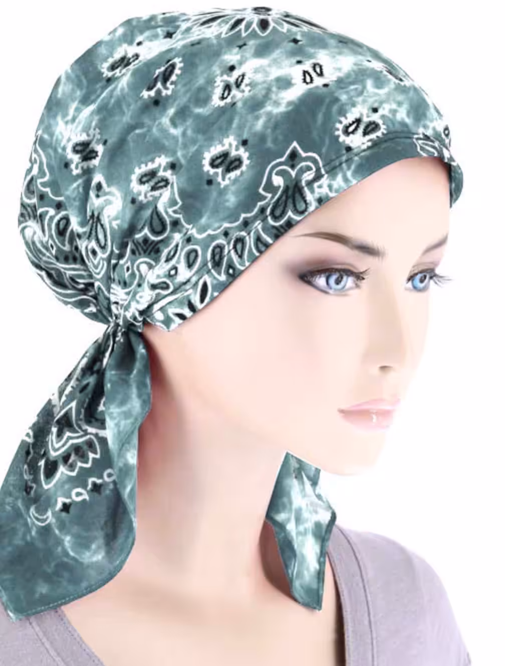 Why fuss with a square bandana when you can look stylish with no extra effort? Our pre tied 100% Cotton Bandana Scarves are ready to wear, just slip it on and off you go! Get the look fuss free with effortless beauty! Part of our Chemo Essentials™ line, which offers no frills, simple every day headcovers.