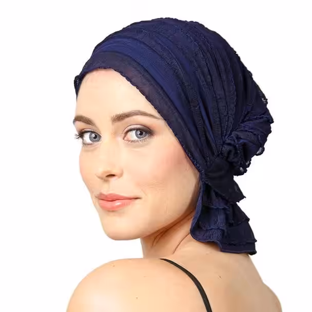 Navy Ruffle Signature slip-on beanie adds feminine volume, producing the subtle look and feel of having hair. The unique elastic design stretches for a comfortable and easy fit. Slips on and off with ease; No tying necessary. Our patented design features a fluent fabric flap for a polished look that provides full coverage around the nape of the neck. Chemo Beanies® ends the search for the perfect fashionable fit and allows women to spend precious time focusing on their healthcare, not their headwear.