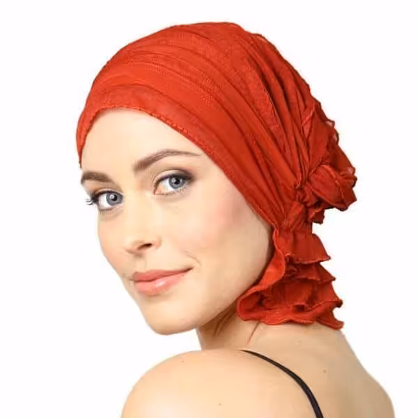 Rust Ruffle Signature slip-on beanie adds feminine volume, producing the subtle look and feel of having hair. The unique elastic design stretches for a comfortable and easy fit. Slips on and off with ease; No tying necessary. Our patented design features a fluent fabric flap for a polished look that provides full coverage around the nape of the neck. Chemo Beanies® ends the search for the perfect fashionable fit and allows women to spend precious time focusing on their healthcare, not their headwear.