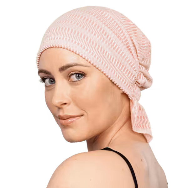 Coral/Ivory Bullet Rail Ribbed Signature Slip-On beanie adds feminine volume, producing the subtle look and feel of having hair. The unique elastic design stretches for a comfortable and easy fit. Slips on and off with ease; No tying necessary. Our patented design features a fluent fabric flap for a polished look that provides full coverage around the nape of the neck. Chemo Beanies® ends the search for the perfect fashionable fit and allows women to spend precious time focusing on their healthcare, not their headwear.