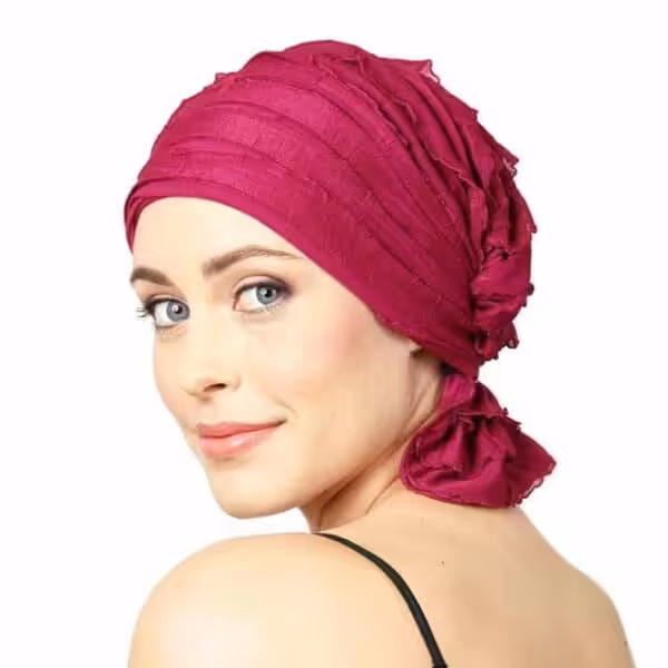Currant Wavy Knit Signature Slip-On beanie adds feminine volume, producing the subtle look and feel of having hair. The unique elastic design stretches for a comfortable and easy fit. Slips on and off with ease; No tying necessary. Our patented design features a fluent fabric flap for a polished look that provides full coverage around the nape of the neck. Chemo Beanies® ends the search for the perfect fashionable fit and allows women to spend precious time focusing on their healthcare, not their headwear.