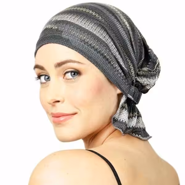 Grey Neutrals Aztec Print Signature Slip-On beanie adds feminine volume, producing the subtle look and feel of having hair. The unique elastic design stretches for a comfortable and easy fit. Slips on and off with ease; No tying necessary. Our patented design features a fluent fabric flap for a polished look that provides full coverage around the nape of the neck. Chemo Beanies® ends the search for the perfect fashionable fit and allows women to spend precious time focusing on their healthcare, not their headwear.