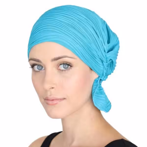 Turquoise Wavy Textured Knit Signature Slip-On beanie adds feminine volume, producing the subtle look and feel of having hair. The unique elastic design stretches for a comfortable and easy fit. Slips on and off with ease; No tying necessary. Our patented design features a fluent fabric flap for a polished look that provides full coverage around the nape of the neck. Chemo Beanies® ends the search for the perfect fashionable fit and allows women to spend precious time focusing on their healthcare, not their headwear.