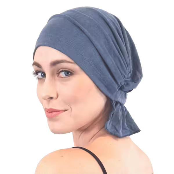 Jean Blue Jersey Knit Signature Slip-On beanie adds feminine volume, producing the subtle look and feel of having hair. The unique elastic design stretches for a comfortable and easy fit. Slips on and off with ease; No tying necessary. Our patented design features a fluent fabric flap for a polished look that provides full coverage around the nape of the neck. Chemo Beanies® ends the search for the perfect fashionable fit and allows women to spend precious time focusing on their healthcare, not their headwear.