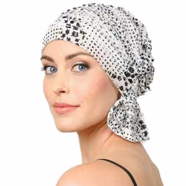 White with Black Floral Ruffle Signature slip-on beanie adds feminine volume, producing the subtle look and feel of having hair. The unique elastic design stretches for a comfortable and easy fit. Slips on and off with ease; No tying necessary. Our patented design features a fluent fabric flap for a polished look that provides full coverage around the nape of the neck. Chemo Beanies® ends the search for the perfect fashionable fit and allows women to spend precious time focusing on their healthcare, not their headwear.