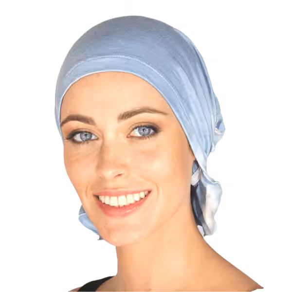 Sky Blue Tie-Dye Signature Slip-On beanie adds feminine volume, producing the subtle look and feel of having hair. The unique elastic design stretches for a comfortable and easy fit. Slips on and off with ease; No tying necessary. Our patented design features a fluent fabric flap for a polished look that provides full coverage around the nape of the neck. Chemo Beanies® ends the search for the perfect fashionable fit and allows women to spend precious time focusing on their healthcare, not their headwear.