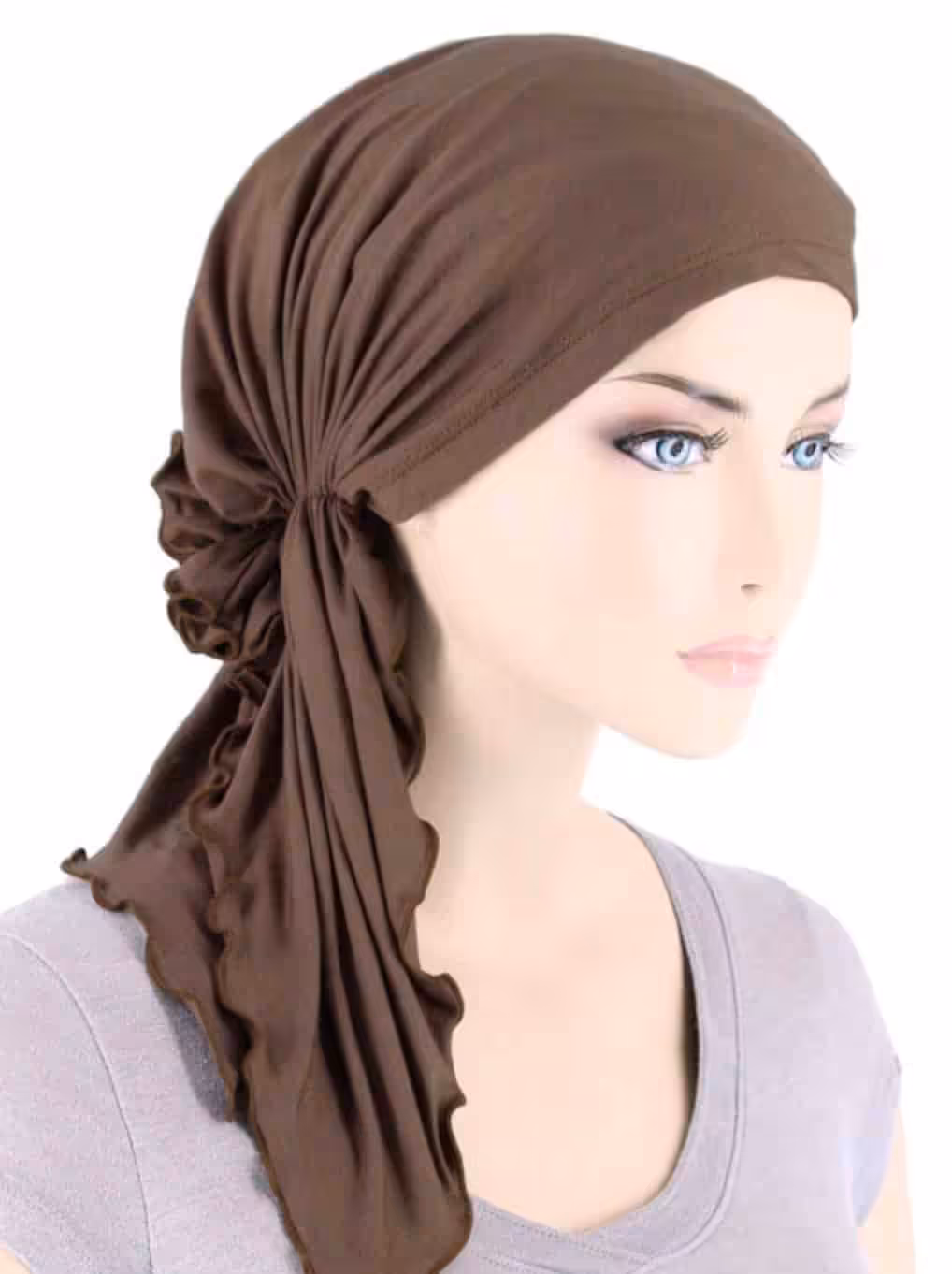 Our Organic Bamboo slip-on head scarf is soon to be your favorite! No more stress trying to tie a square scarf! The Bella Scarf in Bamboo is pretied and requires no tying skills just slip it on & off you go. Get the look fuss free with effortless beauty! Organic Bamboo Fiber is luxuriously soft to the touch and perfect for sensitive scalps. Breathable Bamboo helps regulate heat and wicks away scalp moisture. Our Bella Scarf is beautifully finished with double ties draped flowingly on your shoulder or back. Styled ruffled peek-a-boo rosette in the back adds a finished touch.