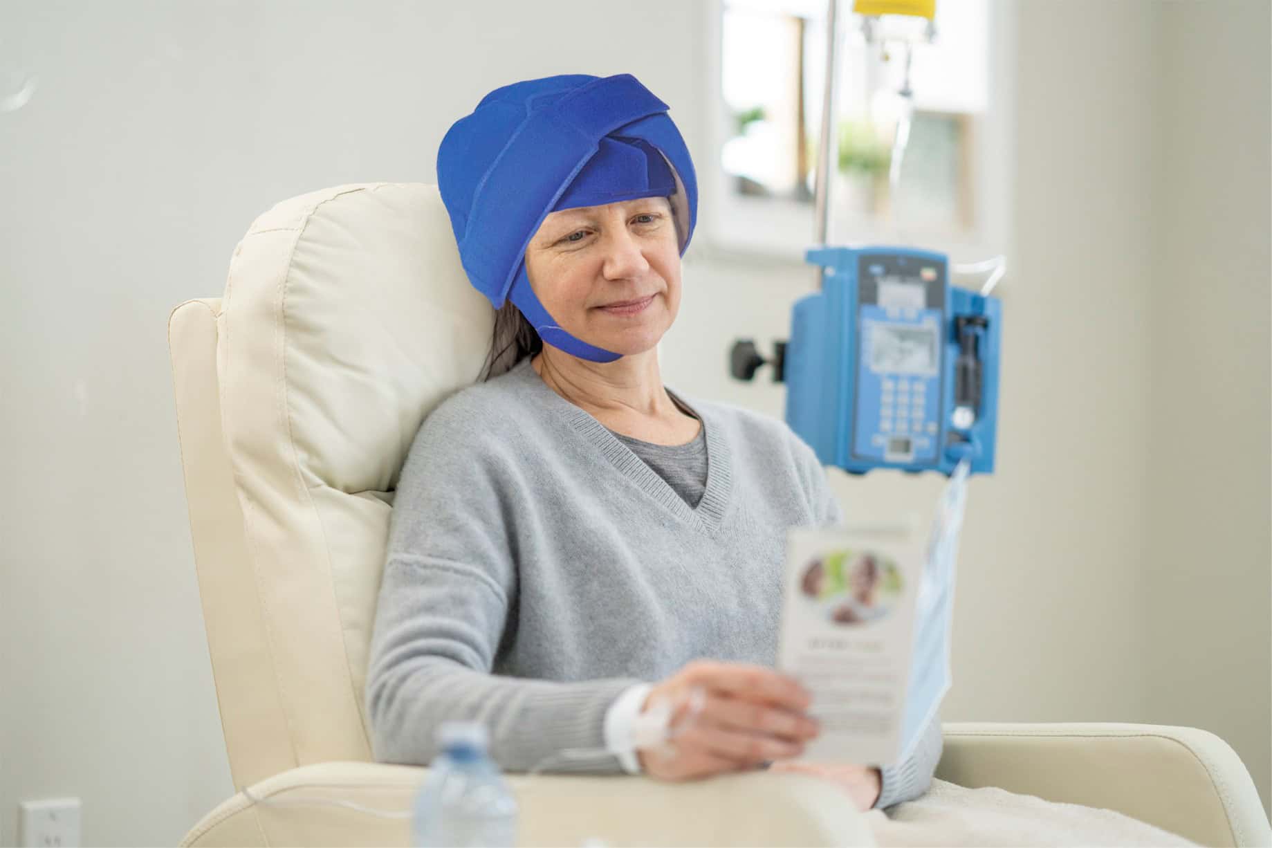 The cap remains on throughout the entire chemotherapy session, maintaining a low scalp temperature and reducing blood flow to hair follicles.