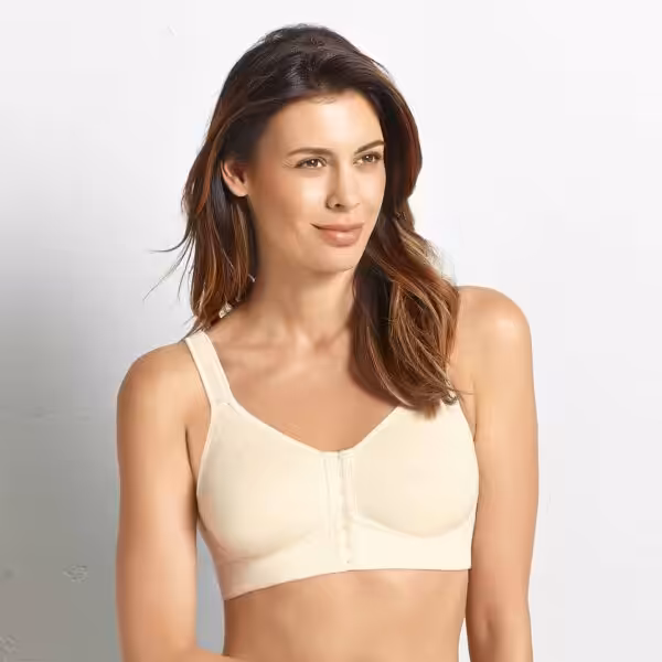 Salvia Post mastectomy bra with front closureStyle no. 5322XOutstanding comfort – this is what the SALVIA post-surgery bra with a front fastener and breast form pockets on both sides stands for.The special bra with seamlessly pre-shaped cups is particularly suitable for wearing during and after radiation therapy and prevents lymph congestion in the side underbust area.The straps and underbust band are covered in soft towelling.